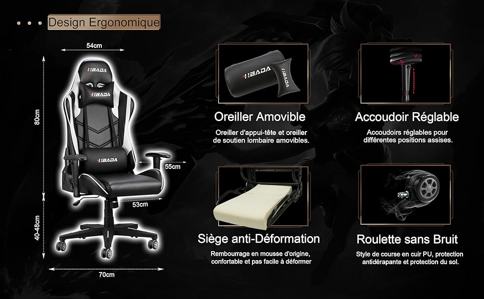 IDEAL FOR THE GAME: Hbada gaming chair is dedicated to creating the best gaming chair with a large seat surface for professional players. Dimensions: 70cm (W) x 70cm (W) x 120-128cm (H); Dimensions of the living room space: 55cm (L) x 53cm (L); Maximum weight capacity: 135 kg.