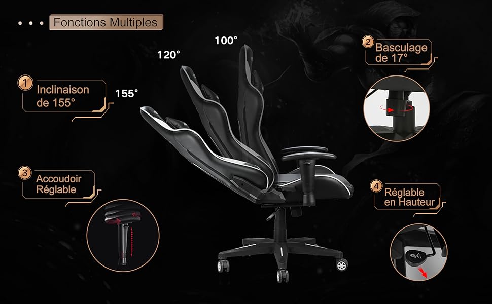 ADJUSTABLE FUNCTIONS: Backrest tiltable from 90 ° to 155 °. The height of the armrest is 7 cm and adapts to different desk heights and seating positions. The seat height of 8 cm makes the chair ideal for you.